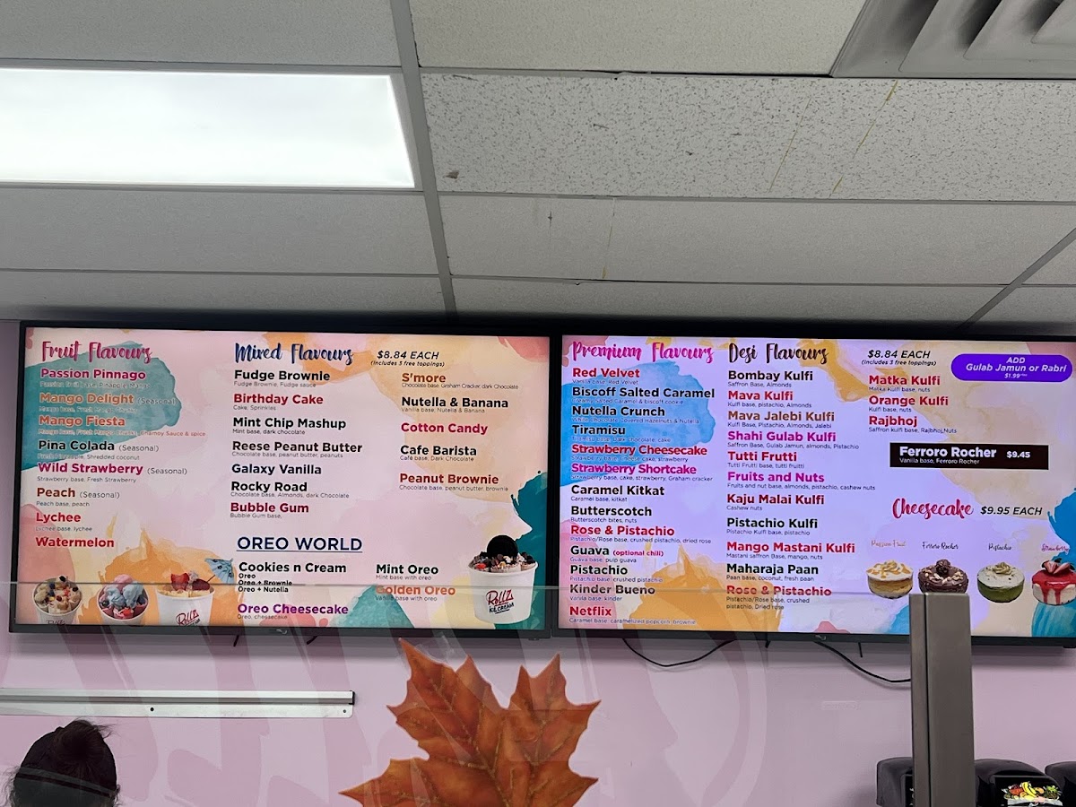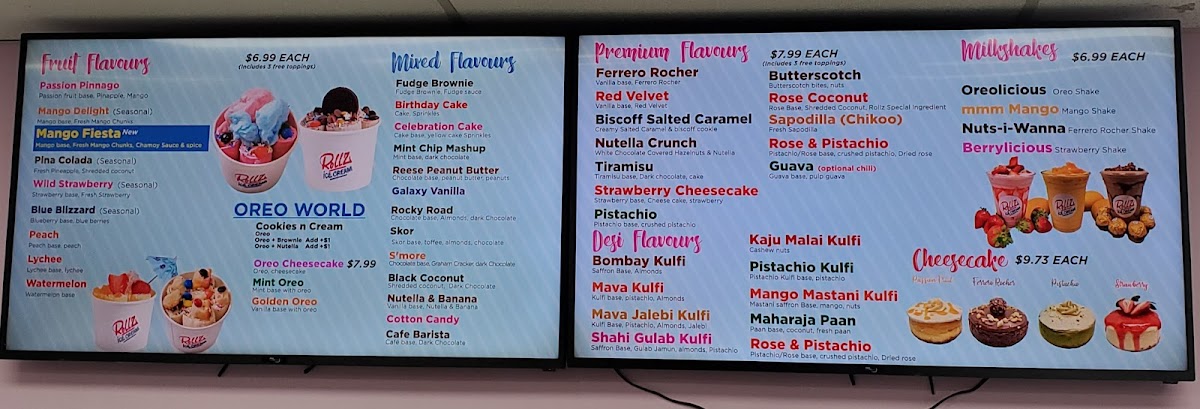 But that's not all Rollz Ice Cream has to offer. Their Desi Kulfi selection includes flavors like Shahi Gulab, Mava Jalebi, Mango Mastani, Kaju Malai, Saffron, and Mava, each bursting with traditional Indian flavors and nuts.