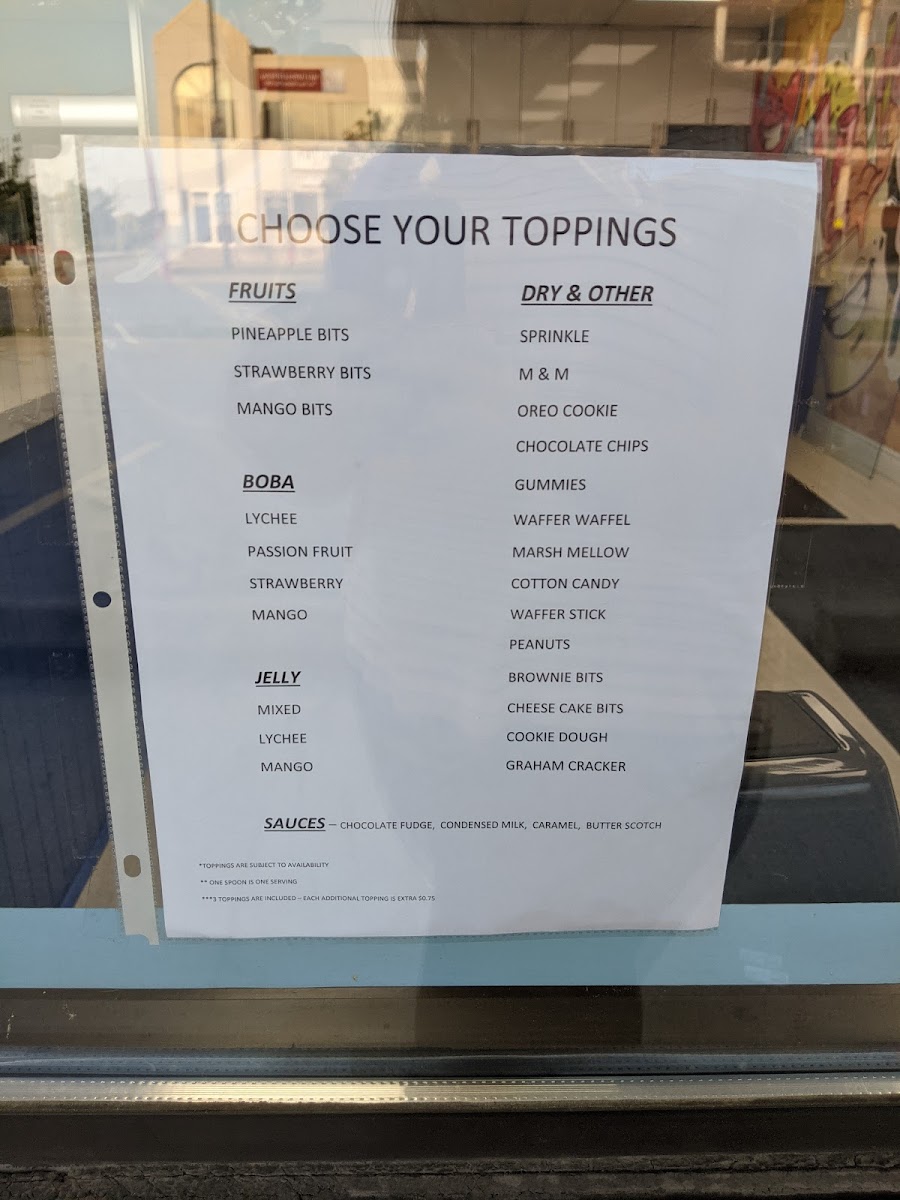 Tons of flavours to pick from (40!) plus lots of topping options to customize. We've never had rolled ice cream before and were worried it would be hard and icy but it was perfectly creamy! Friendly service and a kind owner too. Definitely a place to try this summer, better than the Dairy Queen across the street!